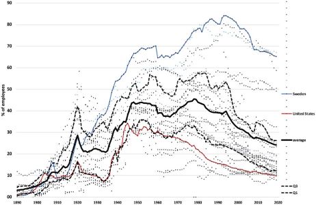 노조 조직률 1890-2019, 30개 산업 국가
