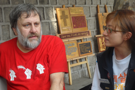 2012년 쌍용자동차 노동자 분향소를 방문한 지젝. 출처 : 참세상 자료사진