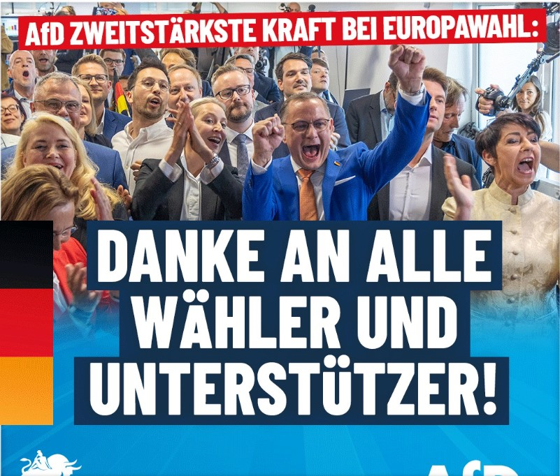 2024년 6월 9일, 독일 극우 정당인 AfD의 지도자 앨리스 바이델과 티노 추팔라가 첫 번째 결과인 16%를 확인한 후 반응하고 있다. 출처 : AfD 페이스북