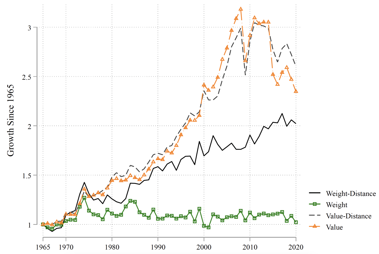 그림 1은 1965년부터 2020년까지의 국제 운송 동향과 기존 무역 통계와의 비교를 보여준다. 운송 사용량(검은 실선)은 원자재 운송을 보여주는데 지난 50년 동안 2배 이상 증가했다. 금액 기준(회색 점선)으로 보면 이러한 운송량 증가는 더욱 커져 1965년부터 2007년까지 세 배로 증가했다가 감소세로 돌아섰다. 이러한 추세를 거리를 고려하지 않는 기존 무역 지표와 비교하면 이 기간 동안 거리의 역할을 강조할 수 있다. 더 많은 상품이 더 멀리 떨어진 국가로 배송되고 있는 것이다.