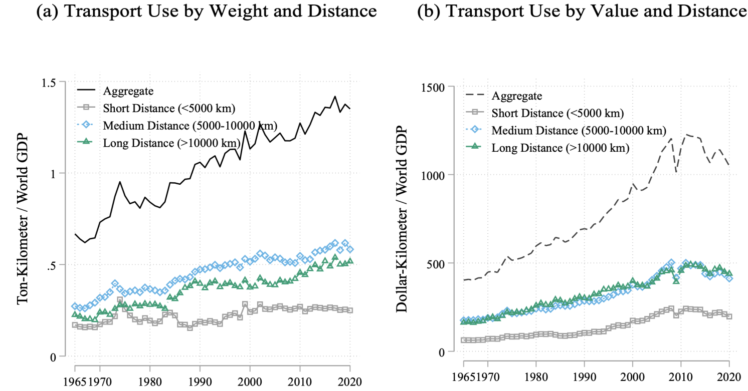 중량 기반 운송 사용량 증가의 대부분은 서로 멀리 떨어져 있는 국가 간의 무역 증가에 기인한다. 그림 4는 그림 1의 운송 사용량 지표를 같은 지역에 있는 두 국가의 단거리 구간(5,000km 이내), 아시아-유럽 무역을 포함하는 중거리 구간(5,000~10,000km), 아시아-북미 무역을 포함하는 장거리 구간 등 세 가지 하위 구성 요소로 분류한 것이다. 초기에는 모든 구간이 중량 기준으로 비슷한 양을 보이지만, 1980년대 이후에는 거리가 먼 국가들의 운송 사용량이 더 많이 증가했다(그림 4a). 대신 가치 기준 운송 사용량은 모든 거리에서 큰 증가세를 보였다(그림 4b). 전반적으로 더 무겁고 가치가 낮은 상품은 멀리 떨어져 있는 국가 간에 거래되는 반면, 더 가볍고 가치가 높은 상품은 가깝고 멀리 떨어져 있는 지역 간에 거래되고 있다.