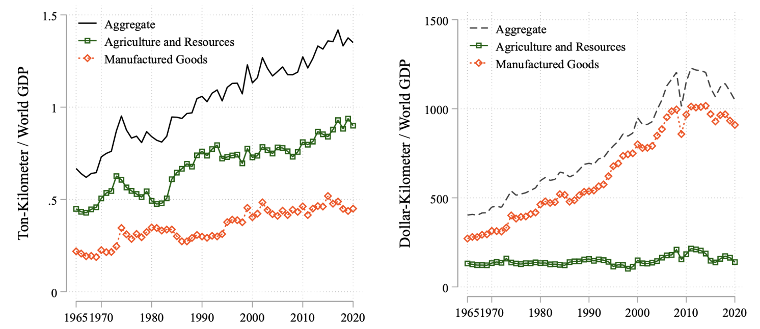1965년부터 2020년까지 전 세계 운송량은 급격히 증가했으며, 더 많은 상품이 더 멀리 운송되고 있다. 운송 서비스는 운송되는 상품의 양과 운송되는 거리라는 두 가지 요소로 구성된다. 운송 사용량은 중량(톤-킬로미터)으로 측정하거나, 금액(달러-킬로미터)으로 측정할 수 있다. 중량 기반 측정은 곡물이나 석유 제품처럼 중량당 가치가 낮은 상품을 반영하는 반면, 가치 기반 측정은 기계나 전자제품처럼 중량당 가치가 높은 상품을 강조한다. 이 두 가지를 모두 거리에 곱하면 수출과 수입을 합산하는 기존 무역 지표에서 누락된 운송 사용량을 측정할 수 있다.