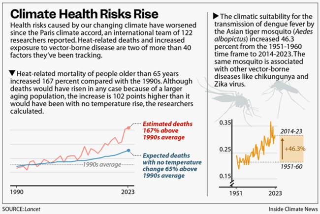 * 아시아 호랑이 모기(Aedes albopictus)의 질병 전파에 유리한 기후 조건은 1951~1960년에 비해 2014~2023년까지 약 46% 증가했다. 황열 모기(Aedes aegypti)의 경우 10% 이상 증가했으며, 이 모기는 뎅기열, 치쿤구니야, 지카 바이러스 및 기타 질병을 전파한다. 최근 발표된 별도의 연구에 따르면, 2023년 전 세계적으로 뎅기열 환자는 650만 명 발생했으며 6,800명 이상이 사망한 사상 최악의 해로 기록될 것으로 보인다.