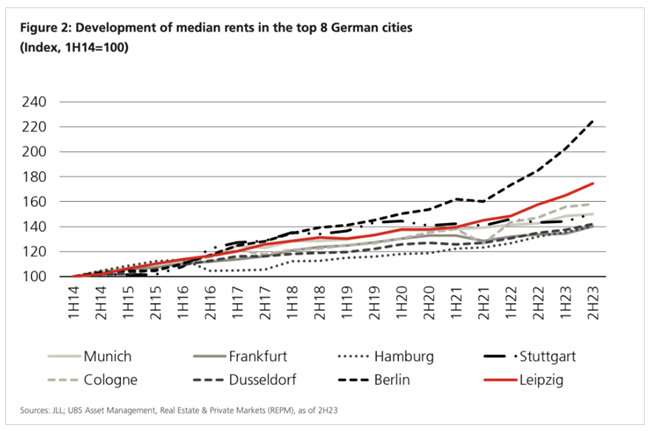 이로 인해 임대 주택 시장의 부족 현상은 임대료 급등으로 이어졌다. JLL에 따르면, 2014년부터 2023년까지 독일 주요 8개 도시의 중간 임대료는 약 60% 상승했다. 베를린은 특히 높은 상승률을 보여 중간 임대료가 두 배로 뛰었으며, 같은 기간 베를린 인구는 9% 증가해 독일 전체 인구 증가율(4.3%)보다 훨씬 높았다.