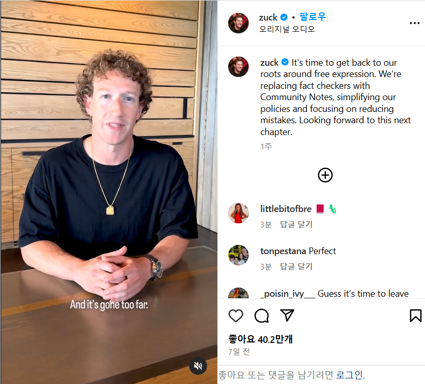 저커버그는 특히 최근 미국 대선 이후 메타가 "자유로운 표현이라는 뿌리로 돌아가야 할 때"라며 이를 "발언을 다시 우선시하는 문화적 전환점"이라고 설명했다.