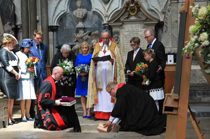 웨스트민스터 사원(Westminster Abbey)에 있는 호킹의 묘지에 유골함을 안치하고 있는 장면. 런던 웨스트민스터 사원의 학장과 의회가 주관. 허가를 받아 재현된 내용이다.