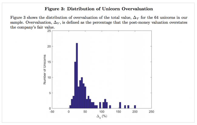 법적 문서에서 확보한 데이터를 분석한 결과고평가된 벤처 캐피털 지원 기업들은 평균적으로 공정 가치보다 49% 높은 가치를 보고했으며일반 주식은 59% 과대 평가된 것으로 나타났다연구 대상 유니콘(공식적으로 10억 달러 이상의 가치를 보고한 기업중 거의 절반(116개 중 53)이 실제 평가 조정 후 유니콘 지위를 상실했으며, 13개 기업은 100% 이상 과대 평가된 것으로 확인되었다.