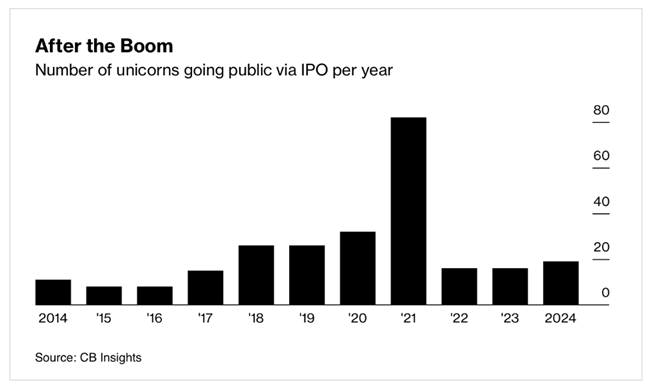 2021년 코로나19 시대의 기술 붐이 정점을 찍었을 때벤처 캐피털의 지원을 받은 스타트업 1,000곳 이상이 10억 달러 이상의 평가를 받았다여기에는 대체육 생산업체 임파서블 푸드(Impossible Foods), 주택 유지보수 마켓플레이스 썸택(Thumbtack), 온라인 강의 플랫폼 마스터클래스(MasterClass) 등이 포함된다그러나 이후 금리 상승, IPO 시장 둔화그리고 AI가 아닌 스타트업들은 도태될 것이라는 분위기 속에서 이들 기업은 심각한 압박을 받게 되었다.