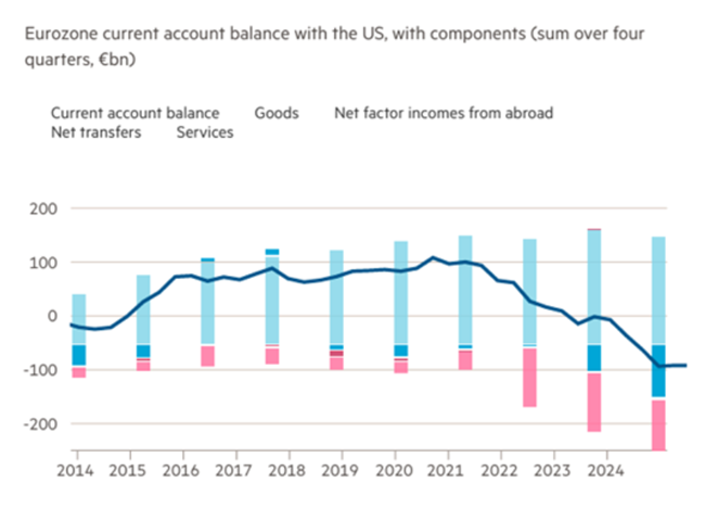 덧붙여, 덴마크 경제학자 예스퍼 랑비드(Jesper Rangvid)에 따르면, 트럼프는 상품에 대한 양자 간 무역만 고려할 뿐, 서비스 무역과 자본 및 노동에서 발생하는 수익을 무시하고 있다. 실제로 미국이 유로존에 수출하는 서비스 수익과 자본 및 노동에서 얻는 수익은 상품 무역에서 발생하는 양자 간 적자를 상쇄하고 있다. 결과적으로, 유로존과 미국 간의 양자 간 경상수지 균형은 거의 0에 가깝다.