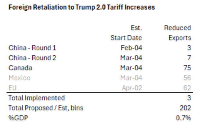 실제로 매우 빠르게 진행되었다. 어제 트럼프는 캐나다와 멕시코에서 미국으로 들어오는 상품에 25%의 관세를 부과했고, 중국산 수입품에는 추가로 10%의 관세를 부과했다. 이로 인해 미국의 세 개 주요 교역국 모두가 상당한 무역 장벽에 직면하게 되었다. 이에 즉각적으로 반응한 중국은 3월 10일부터 미국산 농산물, 즉 대두, 쇠고기, 옥수수, 밀 등에 10~15%의 관세를 부과하겠다고 발표했다. 캐나다 역시 1,070억 달러 규모의 미국산 수입품에 대한 관세를 공개하며, 우선 210억 달러어치의 수입품부터 즉각 적용한다고 밝혔다. 쥐스탱 트뤼도 캐나다 총리는 “캐나다는 이 부당한 결정을 그대로 두지 않을 것”이라고 말했다. 미국이 캐나다에 부과한 관세율은 25%이며, 캐나다산 원유와 에너지 제품에 대해서만 10%가 적용된다. 현재 캐나다는 미국 원유 수입의 약 60%를 차지하고 있다.