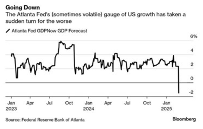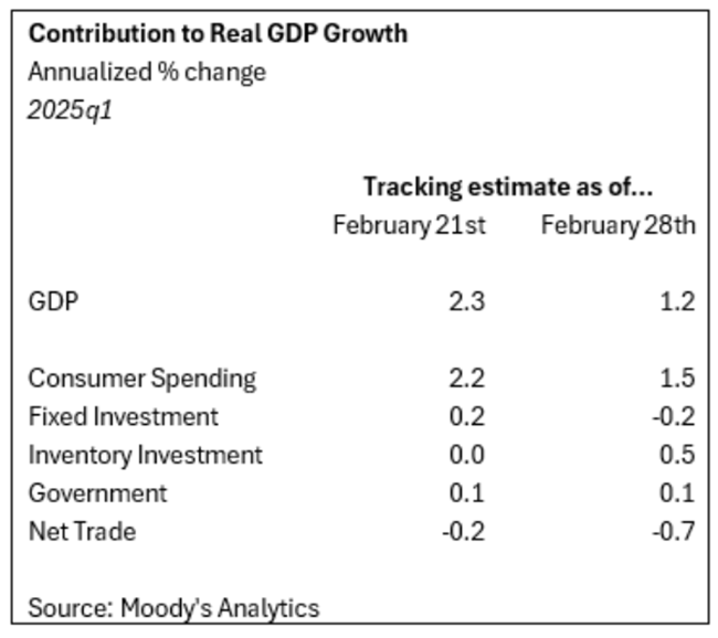 불과 몇 주 만에 미국 경제에 대한 이야기는 ‘예외주의’에서 갑작스러운 성장 둔화에 대한 경고로 급격히 바뀌었다. 소매 판매, 제조업 생산, 실질 소비 지출, 주택 판매, 소비자 신뢰 지수 등이 지난 한두 달 동안 모두 하락했다. 2025년 1분기 실질 GDP 성장률에 대한 컨센서스 전망치는 현재 연율 기준 1.2%에 불과하다.