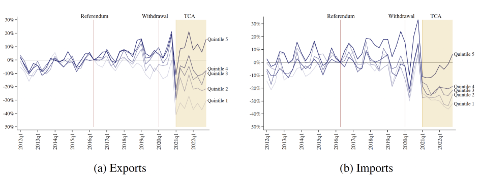 분석 결과, 2021년 TCA 발효 이전에는 EU와의 무역이 세계의 다른 지역과 비교해 유의미하게 감소했다는 증거를 찾지 못했다. 이 결과는 국민투표 이후 무역 장벽이 높아질 것이라는 불확실성과 그에 대한 예상이, 실제로는 EU와의 상대적 무역을 줄이지 않았다는 것을 의미한다. 미래의 무역 비용 증가에 대한 불확실성에 직면한 기업들은, 이미 수출입을 위해 고정비용을 지불한 상태이기 때문에, 불확실성이 해소될 때까지 해외 구매자나 공급자와의 관계를 변경하지 않고 기다리는 쪽을 선택했을 가능성이 있다.