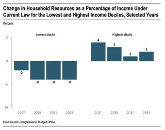 예일대학교 예산연구소의 최근 추산에 따르면소득 하위 20%에 해당하는 가구와 하위 2040%에 해당하는 가구의 세후·이전소득은 각각 5%와 1.4% 감소할 것으로 예상된다반면 소득 상위 2040%와 상위 20%에 해당하는 가구의 소득은 각각 1.4%와 2.5% 증가할 것으로 보인다이러한 손실은 트럼프의 관세 정책으로 인해 중위 가계소득이 2.8% 감소할 것이라는 추정치에 추가되는 것이다. ‘예산·정책 우선센터는 이들 하위 소득계층의 추정 손실이 과소평가되었을 가능성이 높다고 보며이는 학생대출 상환 조건에 영향을 줄 것으로 보이는 하원 교육·노동위원회의 삭감을 고려하지 않았기 때문이다.