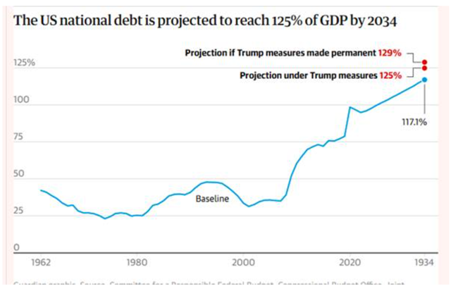 하지만 이것이 미국 지배 엘리트를 걱정하게 만드는 요인은 아니다그들에게 있어 아름답지 않고 추악한 것은 불평등의 심화가 아니라이 예산안이 실행될 경우 나타날 정부 예산 적자와 공공 부채의 급격한 증가다초당적 기구인 연방예산책임위원회는 트럼프의 예산이 2034년 말까지 공공 부채를 최소 3조 3천억 달러 증가시킬 것으로 추산했다이 예산안은 정부 부채 대비 국내총생산(GDP) 비율을 현재의 100%에서 사상 최고치인 125%로 증가시킬 것이다이는 현재 법률 하에서 2034년까지 예상되는 117% 상승보다 높은 수치다한편연간 재정 적자는 2024년의 약 6.4%에서 6.9%로 증가할 전망이다.