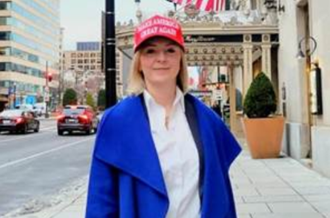 리즈 트러스는 트럼프 취임식 때 착용한 MAGA 모자를 쓰고 있었다.
