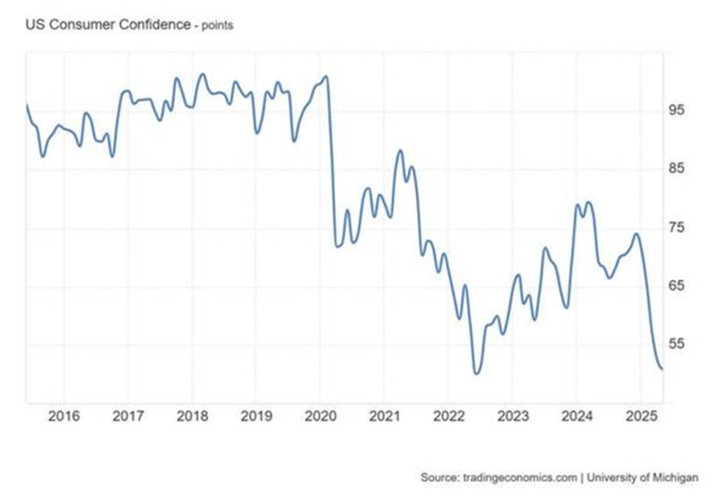 미국 가계 역시 MAGA 고문들이나 투자은행 경제학자들만큼 경제에 대해 자신감을 갖고 있지 않다소비자 신뢰 지수는 사상 두 번째로 낮은 수준까지 떨어졌다.