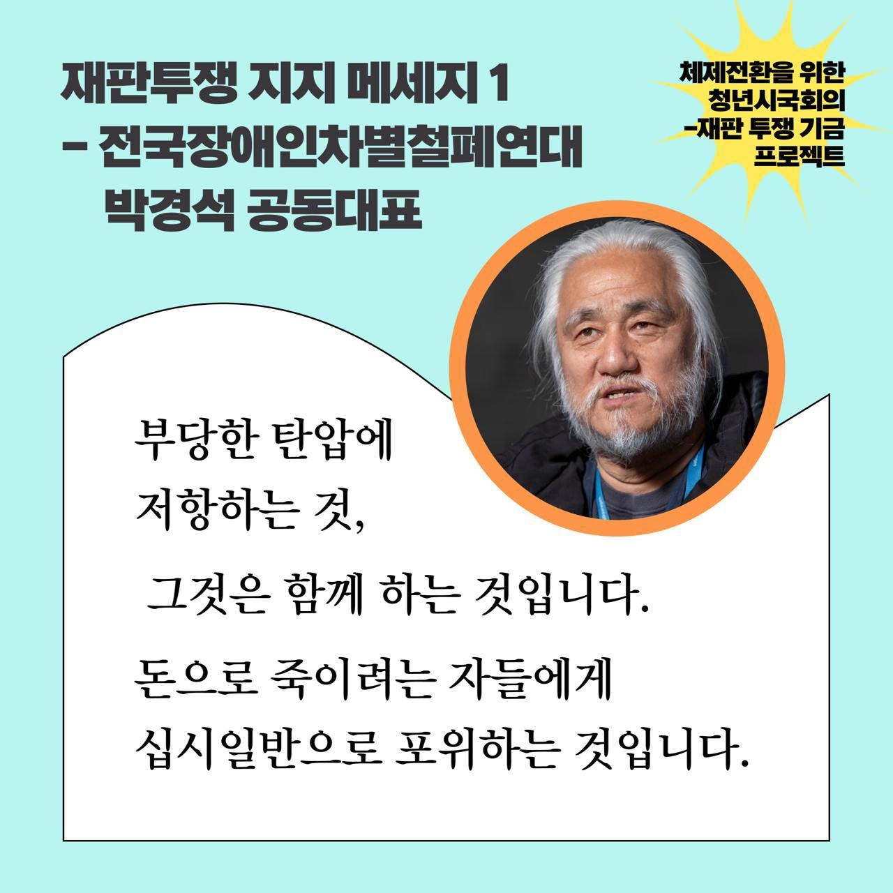 박경석 전국장애인차별철폐연대 공동대표는 "부당한 탄압에 저항하는 것, 그것은 함께하는 것입니다. 돈으로 죽이려는 자들에게 십시일반으로 포위하는 것입니다"라는 재판투쟁 지지 메시지를 보냈다.