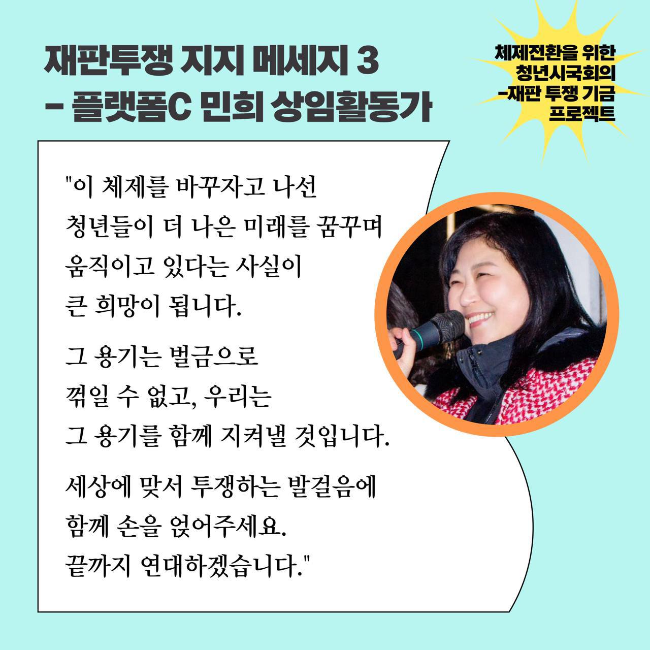 민희 플랫폼C 상임활동가도 "이 체제를 바꾸자고 나선 청년들이 더 나은 미래를 꿈꾸며 움직이고 있다는 사실이 큰 희망이 됩니다. 그 용기는 벌금으로 꺾일 수 없고, 우리는 그 용기를 함께 지켜낼 것입니다. 세상에 맞서 투쟁하는 발걸음에 함께 손을 얹어주세요. 끝까지 연대하겠습니다"라며 마음을 전했다.