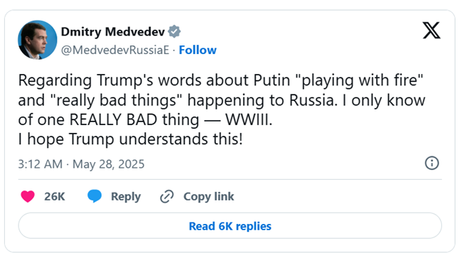 트럼프가 푸틴을 두고 "불장난하고 있다"거나 러시아에 "정말 나쁜 일들이일어났을 것이라고 한 발언과 관련하여내가 아는 정말로 나쁜 일은 단 하나뿐이다 — 제3차 세계대전(WWIII)이다트럼프가 이 점을 이해하길 바란다!