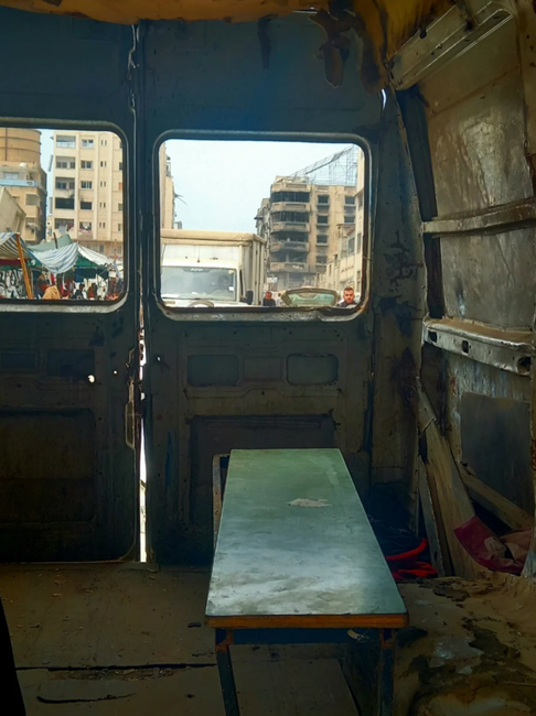 5월 24일, 달리아 아부 라마단(Dalia Abu Ramadan)은 “사람들과 가방을 여전히 실어 나르는 구급차 역할을 하는 불타버린 버스 뒤편에 앉아 있을 때, 피로로 발이 욱신거렸다”고 말했다. 출처: 달리아 아부 라마단(Dalia Abu Ramadan)