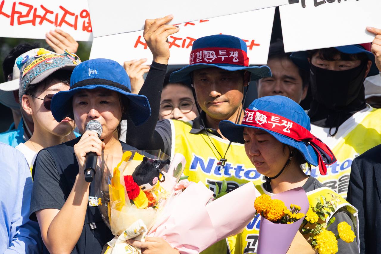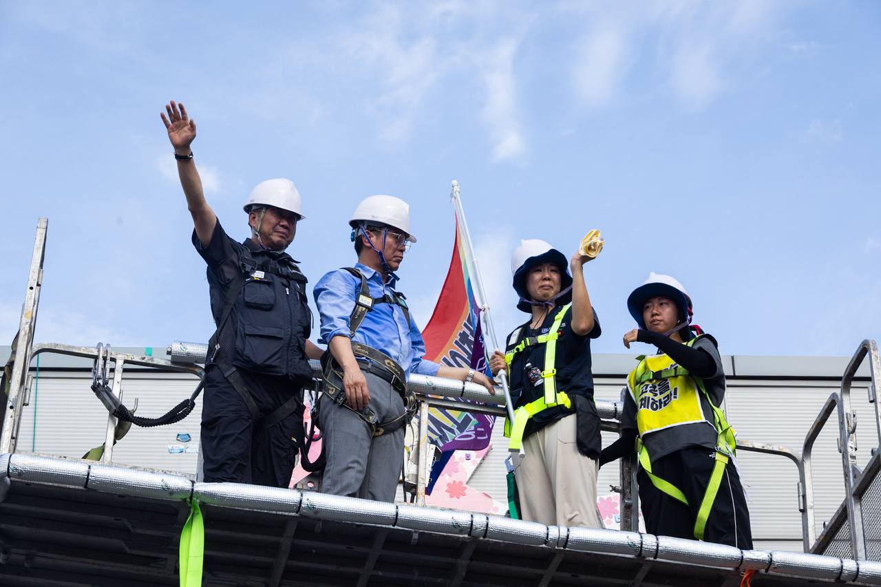 최현환 한국옵티칼하이테크지회장은 이 자리에서 “지난 600일 동안 하늘 위에서 싸워온 박정혜 동지는 우리 모두의 희망이자 투쟁의 상징”이었다며 “그 고통의 시간은 한국옵티칼 노동자의 억울함을 세상에 알렸고, 정의와 책임을 외면하는 자들에게는 부끄러움을 남겼다”고 환기했다.