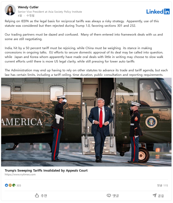 50%의 관세를 맞은 인도는 기뻐하고 있을 것이고, 중국은 협상에서 양보를 할지 말지 입장을 저울질하고 있을 가능성이 있다. EU는 자국 내에서 합의를 비준받으려는 노력 자체가 의문시될 수 있으며, 일본과 한국처럼 문서화가 거의 없는 구두 합의를 진행한 나라들은 미국의 법적 상황이 명확해질 때까지 현재의 노력을 늦추고, 동시에 더 낮은 자동차 관세를 요구하는 압박을 계속할 수도 있다.