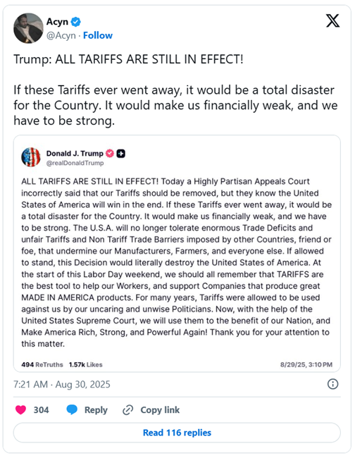 “모든 관세는 여전히 유효하다! 오늘 매우 당파적인 항소법원이 우리의 관세를 철회해야 한다고 잘못 판결했지만, 그들 역시 결국 미국이 승리할 것임을 알고 있다. 만약 이 관세들이 사라진다면, 그것은 미국에 완전한 재앙이 될 것이다. 우리는 재정적으로 약해질 것이고, 우리는 반드시 강해야 한다. 미국은 더 이상 막대한 무역적자와, 다른 나라들 — 우방이든 아니든 — 이 부과하는 불공정한 관세와 비관세 무역 장벽을 용납하지 않을 것이다. 이러한 장벽들은 우리의 제조업체, 농민, 그리고 모든 사람들을 약화시키고 있다. 만약 이번 판결이 그대로 유지된다면, 그것은 미국을 사실상 파괴하는 결과를 초래할 것이다. 이번 노동절 주말을 맞아, 우리는 관세야말로 우리의 노동자들을 돕고, 미국산 제품을 생산하는 기업들을 지원하는 최고의 도구라는 점을 기억해야 한다. 수년 동안, 관세는 무책임하고 어리석은 정치인들에 의해 우리를 공격하는 수단으로 사용되었다. 하지만 이제, 미국 연방대법원의 도움으로 우리는 관세를 국가의 이익을 위해 활용할 것이며, 다시 한 번 미국을 강하고, 위대하고, 강력하게 만들 것이다. 이 문제에 관심을 가져줘서 고맙다.”