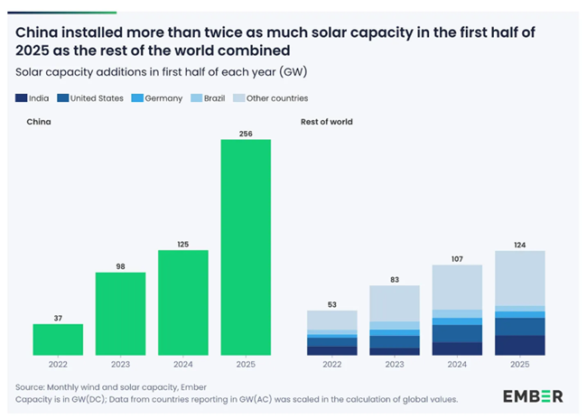 2025년 상반기 중국의 신규 설치량은 올해 전 세계 다른 모든 나라가 설치한 신규 용량의 두 배 이상이었다. 2위인 인도는 24GW를 설치했고, 3위인 미국은 21GW를 설치했다이는 규모에서 한 자릿수(, 10차이가 난다.