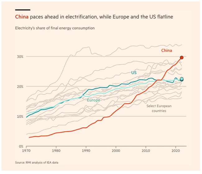 유럽과 미국에서는 최종 에너지 소비에서 전기가 차지하는 비중이 22%에 머물러 있으며탈탄소화를 둘러싼 온갖 호들갑에도 불구하고 10년 넘게 변하지 않고 있다반면 중국에서는 전기의 비중이 30%까지 올라갔고그 궤적은 가파르게 상승하고 있다(참고로 상위 이례치는 일본이다). 전기는 저배출 방식으로 생산할 수 있음을 알기 때문에전기화는 에너지 시스템을 정화하는 관문이다.