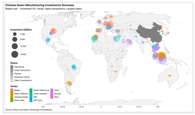 그리고 중국은 단순히 태양광 패널만 수출하는 것이 아니라, 2022년부터는 제조업 분야에서 대규모 해외 직접 투자(FDI)에도 나서고 있다존스홉킨스대학 넷제로정책랩(Net Zero Policy Lab)과 보스턴대학교 글로벌개발정책센터(Global Development Policy Center)의 동료들은 중국의 해외 녹색 제조업 투자를 다룬 주목할 만한 데이터베이스를 구축했다나는 이 수치들을 다시 다룰 예정인데이는 태양광을 넘어선 영역까지 포함한다그러나 이는 녹색 에너지 제조 역량이 확산고 있다는 반가운 신호다.
