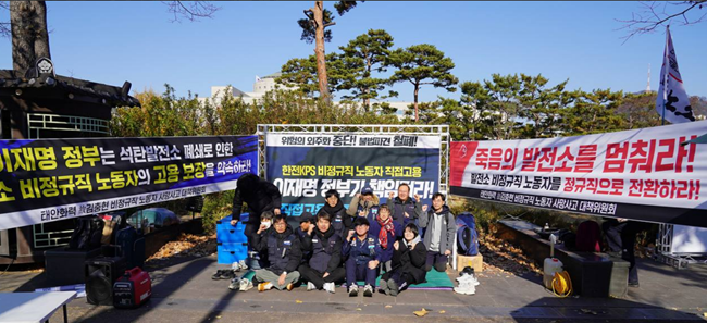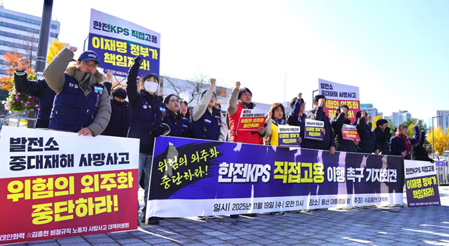 한전KPS 비정규직 노동자들과 고 김충현 노동자 사망사고 대책위원회가 19일 오전 11시, 용산 대통령실 앞에서 기자회견을 열고한전KPS의 불법파견 중단과 비정규직 노동자 전원의 직접고용을 촉구하며 농성에 돌입했다비정규직 노동자들은 서울지방법원 판결과 고용노동부 근로감독이 연달아 불법파견을 확인하고도 정부와 한전KPS가 직접고용을 미루고 있다고 목소리 높였다.
