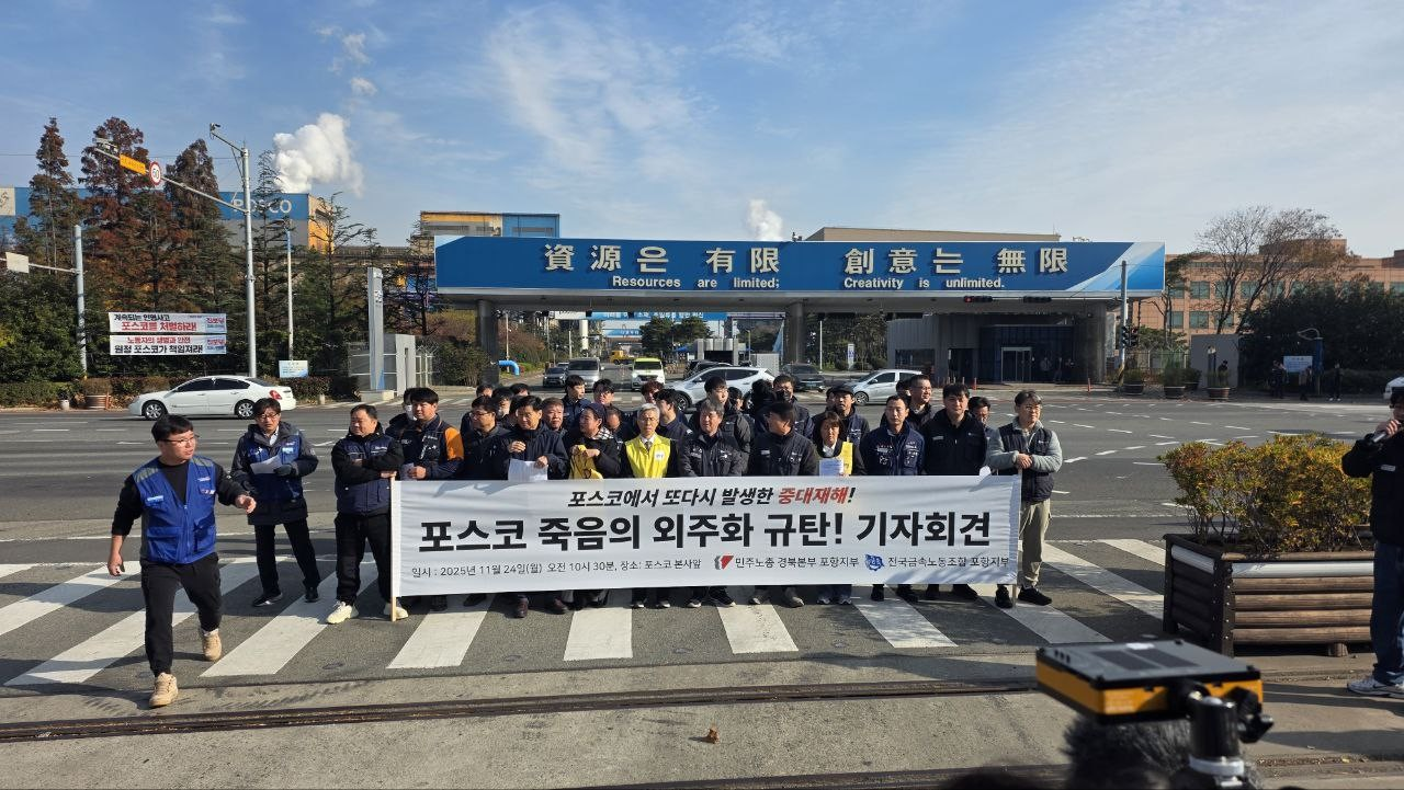 민주노총 경북본부 포항지부와 금속노조 포항지부는 24일 포스코 본사 앞에서 기자회견을 열고, “이번 사고는 반복되는 불법파견과 위험의 외주화가 만든 구조적 참사라고 주장했다사고는 20일 포항제철소 STS4 제강공장에서 실외 버큠카 청소작업을 하던 중 발생했으며코크스 오븐 가스에 포함된 일산화탄소가 갑작스럽게 유입된 것으로 추정된다작업자들은 사고 지점이 평소 가스가 나오지 않는 구간이라고 인지하고 있었던 것으로 알려졌다.