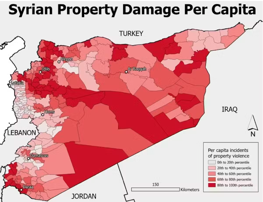 분쟁 감시 단체 ACLED가 2014년부터 2025년까지의 14만 건 이상의 폭력 사건 보고서를 분석한 결과재산 피해는 해안 지역보다 내륙 지역에서 더 집중적으로 발생했으며알레포이들립홈스 같은 도시는 특히 큰 피해를 보았다.