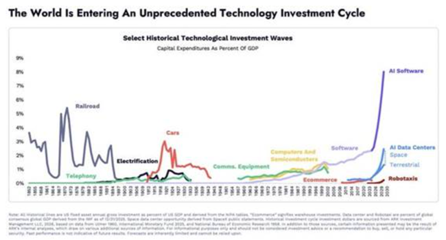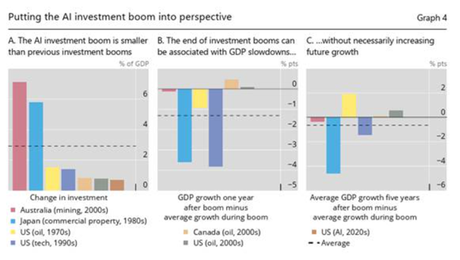 이른바 하이퍼스케일러’(hyperscalers, 초대형 규모의 데이터센터와 클라우드 인프라를 운영하는 글로벌 기술 기업들)와 거대 기술 기업들은 인공지능 데이터센터와 반도체 칩 등에 대한 설비투자를 계속해서 쏟아붓고 있다그러나 지금까지 인공지능 관련 투자의 증가는 역사적 기준에서 보면 특별히 큰 수준은 아니다국제결제은행(BIS)의 한 연구에 따르면인공지능 투자는 미국 GDP의 약 1% 수준으로이는 2010년대 중반 미국의 셰일 붐과 비슷한 규모이며 1990년대 닷컴 붐 시기의 정보기술 투자 증가의 절반 정도에 해당한다. 1980년대 일본에서 나타난 상업용 부동산 투자 붐과 2010년대 호주에서 경험한 광업 투자 붐은 GDP 대비 규모가 이보다 다섯 배 이상 컸다.