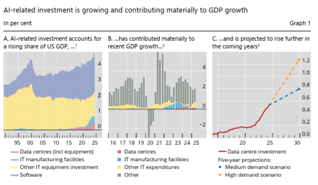 기업들이 인공지능 활용을 위해 장비와 소프트웨어에 지출하는 비용까지 포함한 전체 IT 투자는 최근 분기들에서 GDP 성장의 거의 절반을 차지했다이는 트럼프의 무역 관세가 성장에 미친 부정적 영향을 완화하는 데 기여했다데이터센터에 대한 연간 지출만 보더라도향후 5년 동안 1천억 달러에서 2250억 달러 사이로 증가할 수 있다이렇게 되면 데이터센터 지출만으로도 GDP 대비 비중이 현재의 0.5%에서 0.8~1.3% 수준으로 올라가게 된다.