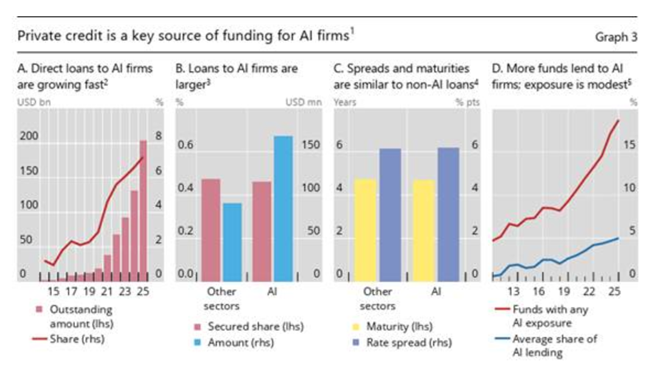 전통적인 은행권 바깥에 있는 사모 신용 펀드(private credit fund)가 인공지능 관련 부문에 제공하는 대출도 빠르게 늘어났다그 규모는 현재 2천억 달러를 넘었으며전체 대출 잔액에서 차지하는 비중도 1% 미만에서 거의 8%까지 상승했다이런 비규제 자금원에서 나온 대출은 이번 10년이 끝날 무렵까지 세 배로 늘어날 수 있다또한 인공지능과 관련된 핵심 기업들 가운데 상당수는 아직 주식시장에 상장돼 있지 않다이들의 부채 차입은 닷컴 붐 시기에는 보지 못했던 결과를 낳을 수 있다.