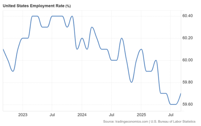 <미국 고용률 (%)>, 기간: 2023년~2025년 9월, 출처: tradingeconomics.com | 미국 노동통계국