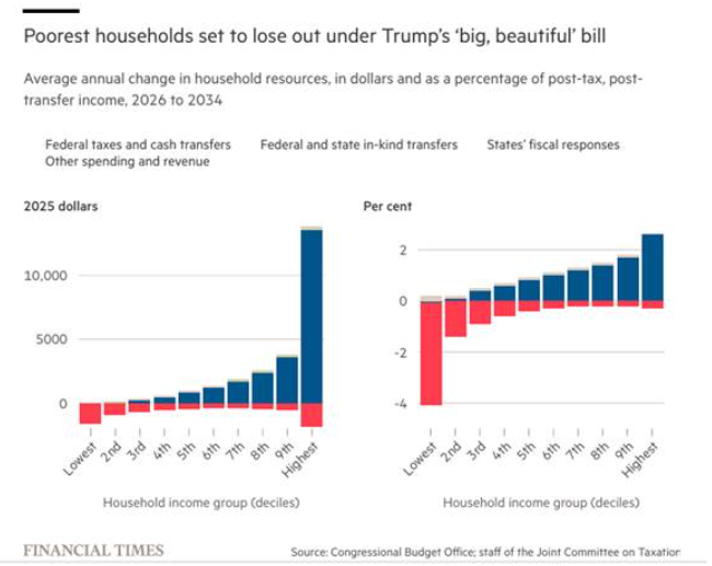 <가장 가난한 가구들, 트럼프의 '크고 아름다운' 법안 아래 손해 볼 것으로 예상됨>, 2026년~2034년 기간 동안, 세후·이전소득 기준 가구 자원 연평균 변화 (달러 및 퍼센트), 빨간색: 연방 세금 및 현금 이전, 하늘색: 연방 및 주정부 현물 이전, 남색: 주 정부의 재정 대응, 회색: 기타 지출 및 수입/ 왼쪽 그래프: 2025년 달러 기준 가계소득 계층별 자원 변화, 오른쪽 그래프: 퍼센트 기준 소득 대비 자원 변화율, 출처: 미국 의회예산처(CBO), 미국 조세합동위원회 직원(Source: Congressional Budget Office; staff of the Joint Committee on Taxation), FINANCIAL TIMES