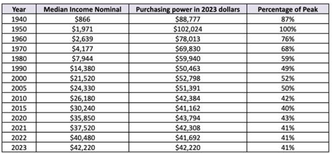 공식 통계에 따르면, 미국 중위 실질 가족소득은 1960년부터 2024년까지 62% 증가했다. 그러나 우리가 계산한 가치 기반 인플레이션율을 적용하면, 1960년 대비 실질 소득은 오히려 20% 감소했다. 사실상 실질 소득이 증가한 시기는 소위 ‘황금기’였던 1960년부터 1973년까지밖에 없었다. 신자유주의 시대였던 1974년부터 2000년 사이에는 실질 소득이 14% 하락했고, 장기 침체기로 불리는 2000년부터 2019년까지는 추가로 10% 더 줄었다. 팬데믹 이후 기간에는, 공식 통계로 봐도 실질 소득은 거의 증가하지 않았다. 대부분의 미국인이 경제적으로 우울함을 느끼는 것은 당연하다.