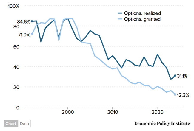 주식 기반 보상 중 스톡옵션 비중, 1992–2024년