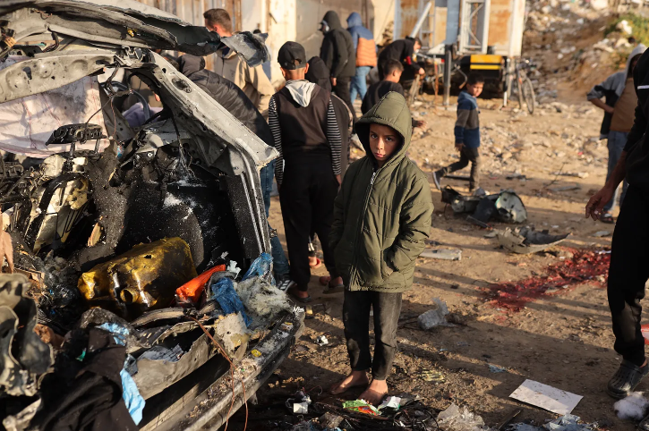 2025년 12월 13가자시의 알라시드(Al-Rashid) 거리에서 이스라엘의 공습으로 파괴된 차량 잔해 옆에 한 소년이 서 있고다른 이들이 차량을 살펴보고 있다이번 공습으로 팔레스타인인 4명이 사망했다출처: Abood Abusalama/Getty Images