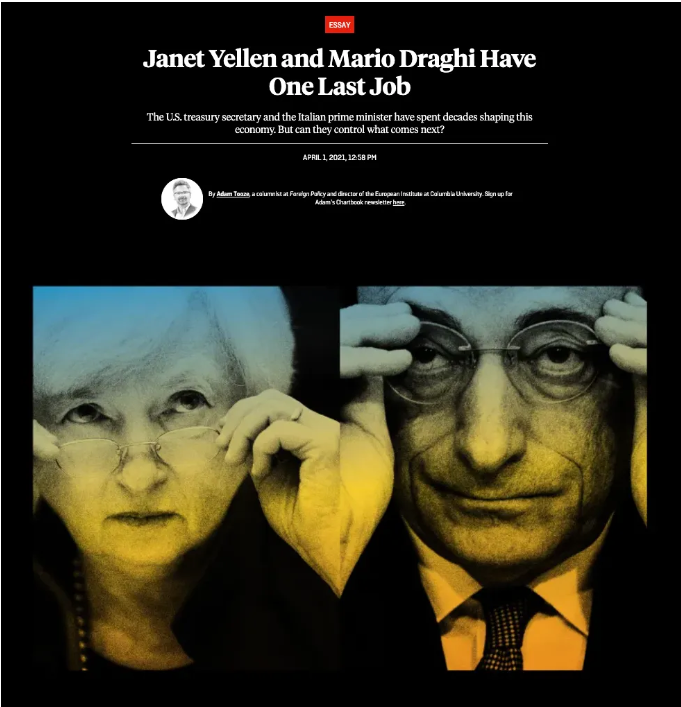옐런에 대한 확장된 해설은, 2021년 8월에 포린 폴리시에 실린 옐런과 마리오 드라기에 대한 이중 초상화에서 다룬 바 있다.