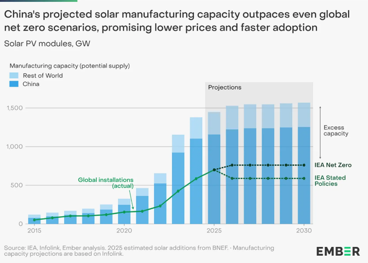 아무리 자주 말해도 지나치지 않다. 중국의 녹색 에너지 설비 확장, 특히 태양광(PV) 생산 능력 확대는 세상을 바꿔놓고 있다. 현재 중국은 혼자만으로도 이산화탄소 순배출 제로(Net Zero)를 위한 ‘최적화된’ 경로에 필요한 태양광 패널 생산 능력보다 50% 이상 많은 생산 능력을 갖췄다. 중국산 패널을 원치 않는 사람들까지 고려해 전 세계의 생산량을 합치면, 우리는 필요량의 두 배에 해당하는 생산 능력을 확보했다.