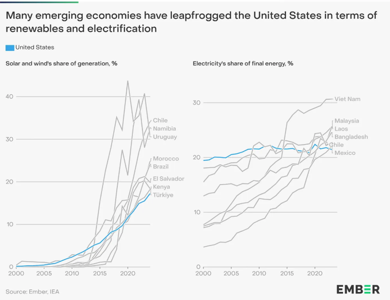 중국 밖에서는, 최근 EMBER의 데이터가 보여주듯 저렴한 재생에너지가 빠르게 성장하는 신흥 시장들이 미국을 추월하도록 돕고 있다. 전력화 수준과 재생에너지 비중 모두에서 그렇다.