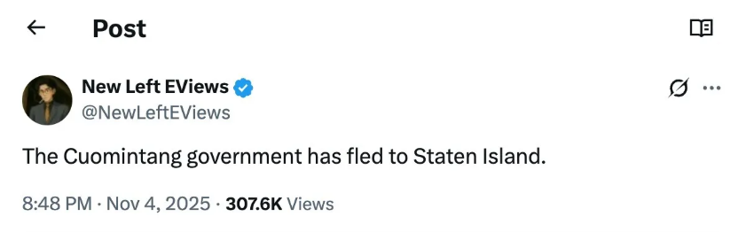 "쿠오민탕 정부가 스태튼 아일랜드로 도망쳤다."(국민당 정부가 대만으로 도망쳤다는 중국 현대사의 사건을 쿠오모에 대입한 패러디)