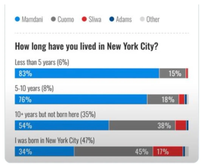 맘다니는 시 전역에서 50%를 약간 넘는 득표율을 기록했다. 뉴욕 전역에서 쿠오모(Cuomo)를 지지한 보수적인 표심도 존재했지만, 쿠오모식 조직 정치는 스태튼아일랜드(Staten Island)라는 외딴섬에서만 확고하게 자리 잡고 있었다.