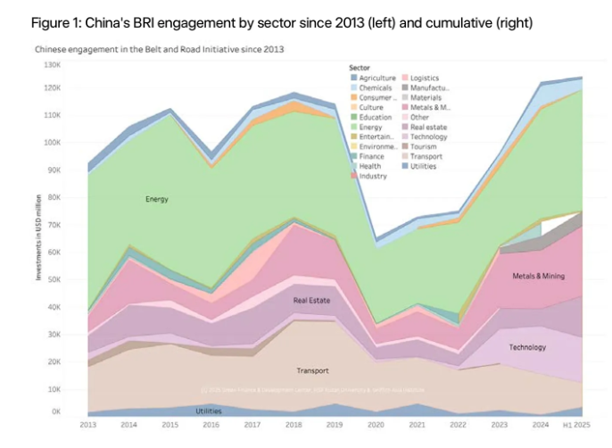 <이코노미스트>(The Economist) 보도에 따르면, 호주 그리피스대학교(Griffith University)의 크리스토프 네도필(Christoph Nedopil)은 상하이에 있는 푸단대학교(Fudan University) 산하 녹색금융개발센터(Green Finance and Development Centre)와 협력해 BRI의 최신 국면에 대한 방대한 데이터를 정리했다. 이 자료에 따르면 2022년 이후 BRI 약정규모가 대폭 증가했고, 2025년 상반기에 사상 최대치를 기록했다.
